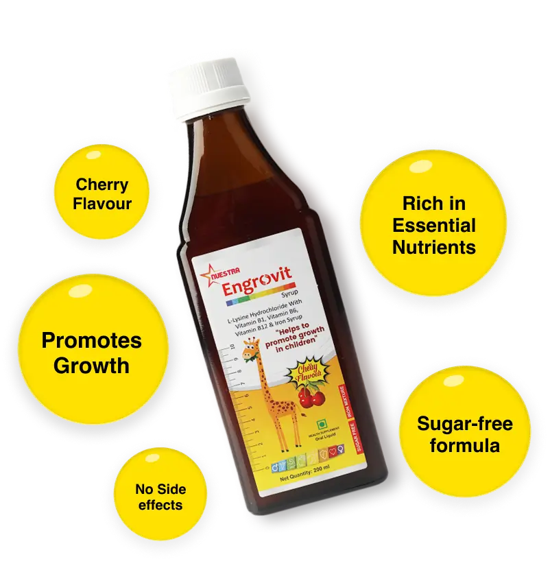 Engrovit is a specially formulated nutrient-rich supplement designed to support your child's growth and unlock their potential. Enriched with Iron, L-lysine amino acid, and essential vitamins like B1, B6, and B12, Engrovit provides the critical nutrients needed for developing children.